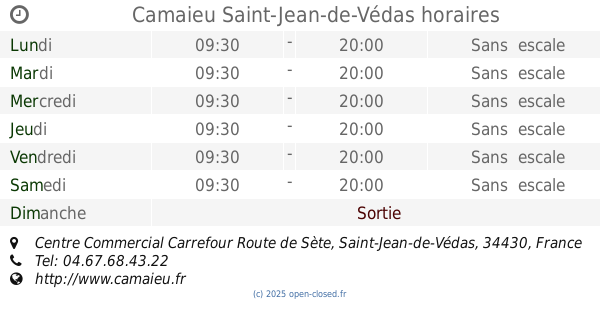 Please note that the information for Camaieu Dans Saint-Jean-de-Védas, Centre Commercial Carrefour Route de Sète and all other Stores is for reference only.